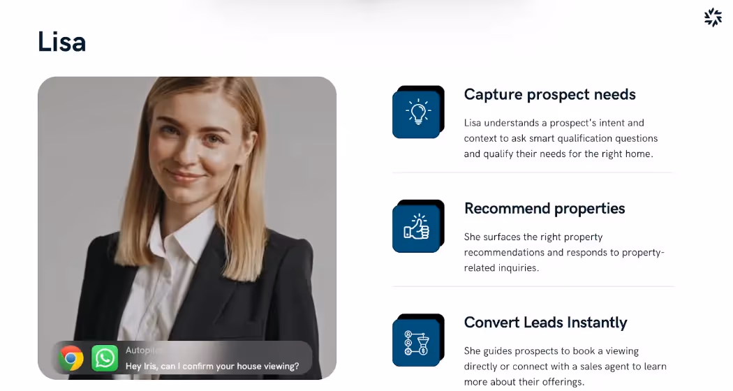 She’s present at every touchpoint of the digital customer journey, starting with engaging traffic 24/7 through human-like sales conversations to pre-scheduling a house viewing based on the real-time availability of the agent’s calendar. Lisa follows up with intelligent questions before scheduling a viewing, uncovering each lead’s true intent, remembering their detailed preferences, and ensuring they’re matched with the right properties - with speed, precision, and accuracy in every conversation.