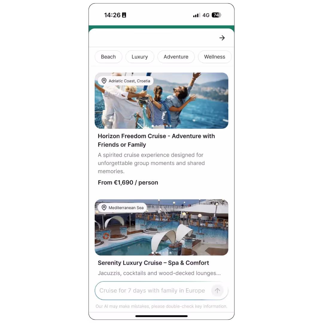 Un assistant en langage naturel qui guide les utilisateurs pour leur proposer des croisières personnalisées sans formulaires, filtres ni délais d’attente.